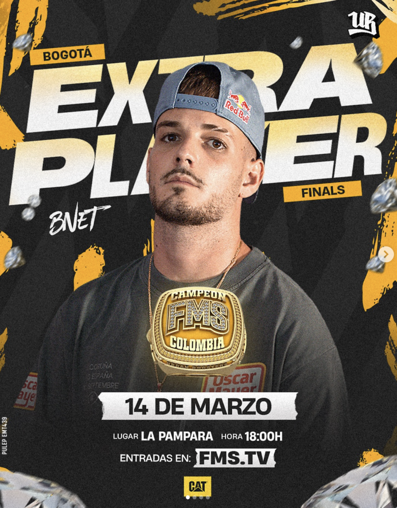 La organización confirmó la participación del freestyler español Bnet, campeón internacional de Red Bull Batalla 2019, como extra player en las FMS Finals de Colombia. El madrileño regresará a la capital colombiana el próximo 14 de marzo en Bogotá, donde formará parte del evento que definirá al campeón de la temporada.